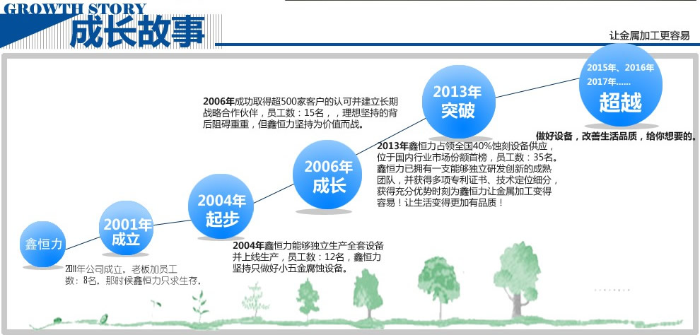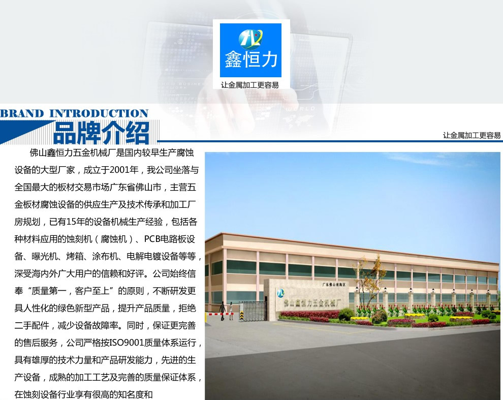 佛山市南海區(qū)鑫恒力五金機械廠座落于全國的不銹鋼生產(chǎn)加工基地—廣東佛山市南海區(qū)桂城石肯工業(yè)區(qū)。 佛山鑫恒力五金機械廠技術(shù)先進、經(jīng)驗豐富、團隊強大、設(shè)備齊全,擁有一支技術(shù)精湛的年輕團隊,掌握完整的腐蝕加工工藝及配套設(shè)備研發(fā)能力。 在國內(nèi)外先進技術(shù)基礎(chǔ)上,我們先后自主研發(fā)推出的了大型(1220mm)不銹鋼花板蝕刻機生產(chǎn)線、滾輪蝕刻機、立式蝕刻機、平曲面蝕刻機、圓盤蝕刻機、精密曝光機、顯影生產(chǎn)線、水平電解退鈦線等一系列先進的金屬蝕刻、前處理設(shè)備和輔助設(shè)施。能在不銹鋼、銅、鐵、鋁等金屬表面上蝕刻及鏤空各種花紋圖案,廣泛應(yīng)用于不銹鋼金屬蝕刻、五金腐蝕加工、工藝禮品蝕刻、不銹鋼電器燈飾腐蝕、廣告裝飾、金屬過濾網(wǎng)等各種行業(yè)。我廠并與國內(nèi)多家化工研究所保持密切合作,熟知市場動向。所生產(chǎn)的蝕刻生產(chǎn)線,能對不銹鋼200系(LH)蝕刻加工。